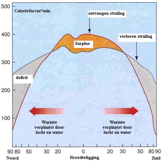 - ten noorden en ten zuiden daarvan = netto verlies van straling