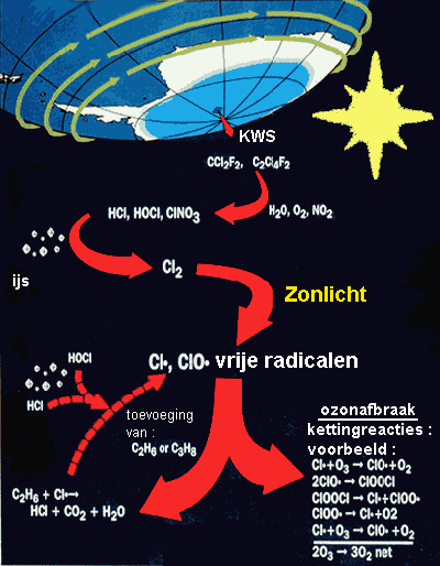 gebruik van CFK's (Chloor-Fluor-Koolwaterstoffen) : Cl zet