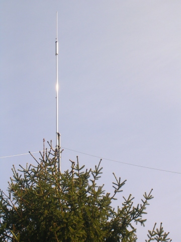 Aluminium pijp met een wanddikte van 2 mm. De radialen zijn van geplastificeerd staaldraad, samen geklemd in een kabelschoen aan de antennemastklem. |